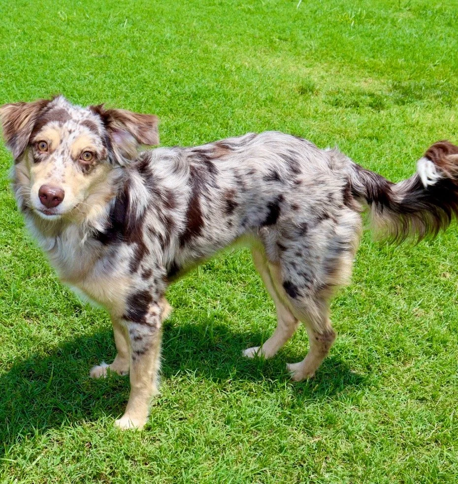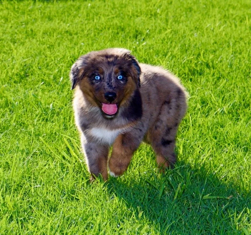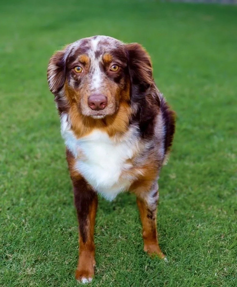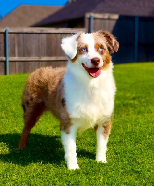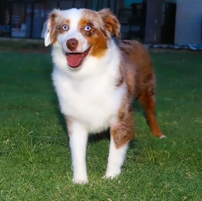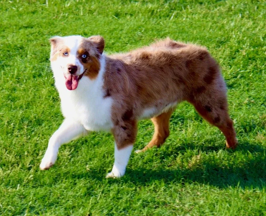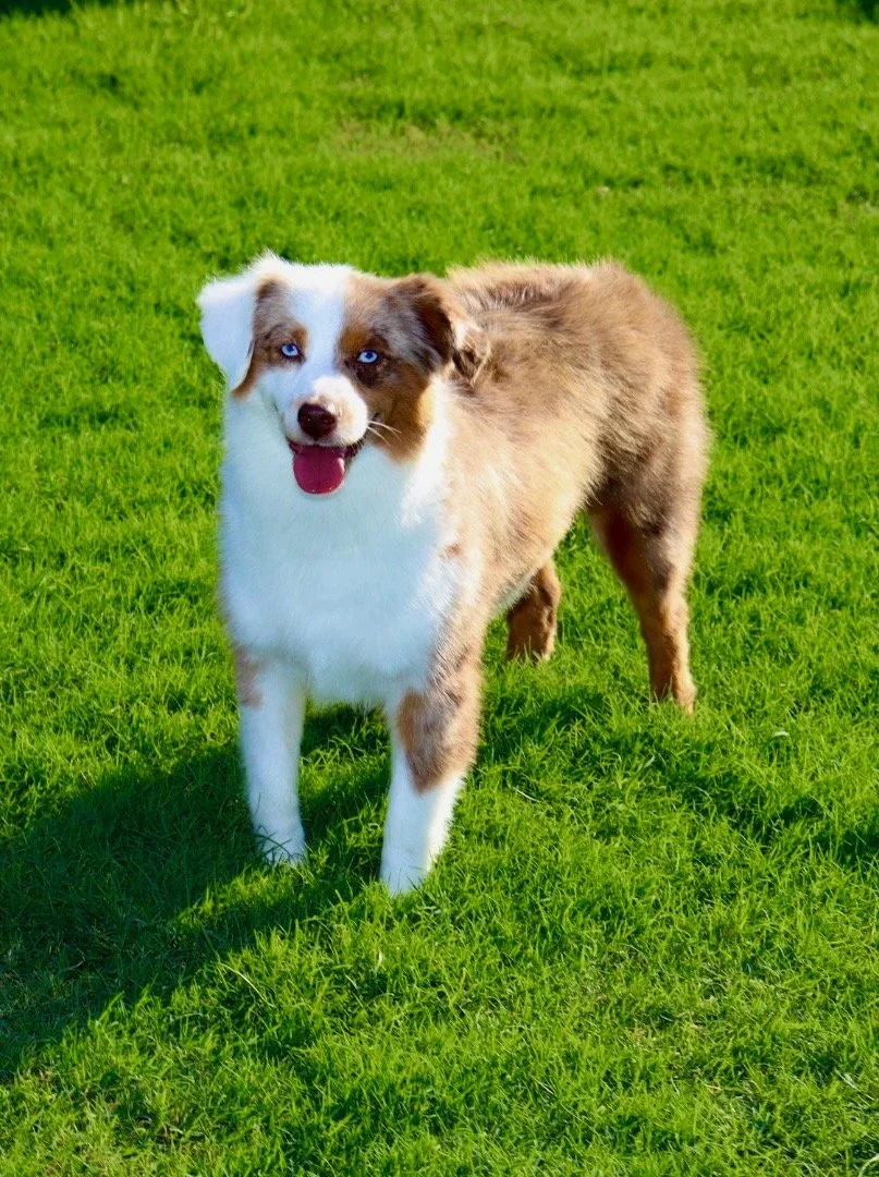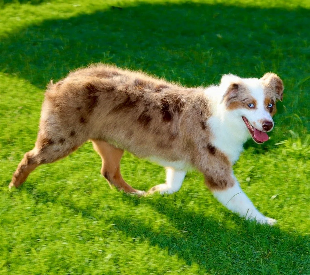 Meet Ellie – our fiery little athlete with a brain to match. This red merle beauty is a small standard Australian Shepherd with copper points and stunning amber eyes that seem to read your mind. Incredibly smart and eager to please, Ellie picks up new commands with ease and thrives when given a job to do. Whether she’s chasing a ball, zipping through agility equipment, or wrestling with her girl gang, she brings intensity and joy to everything she does.