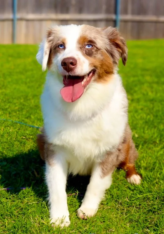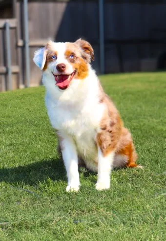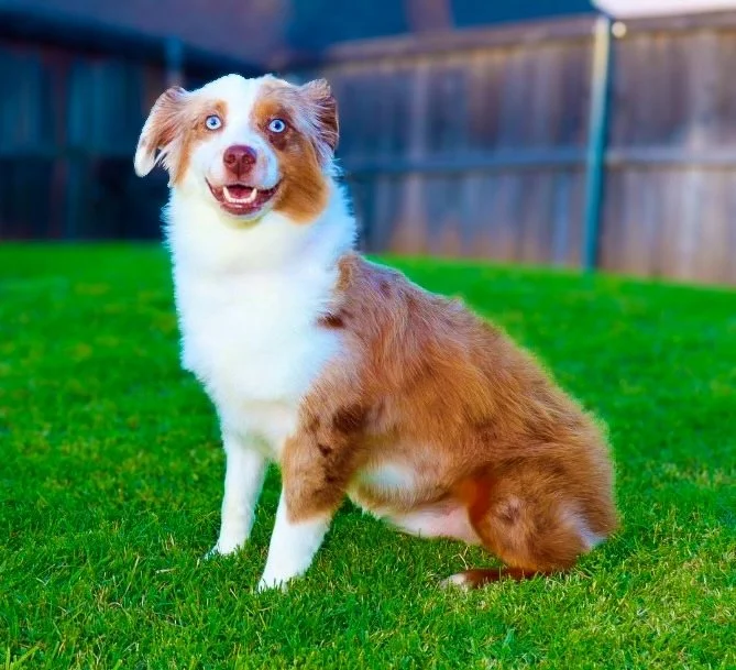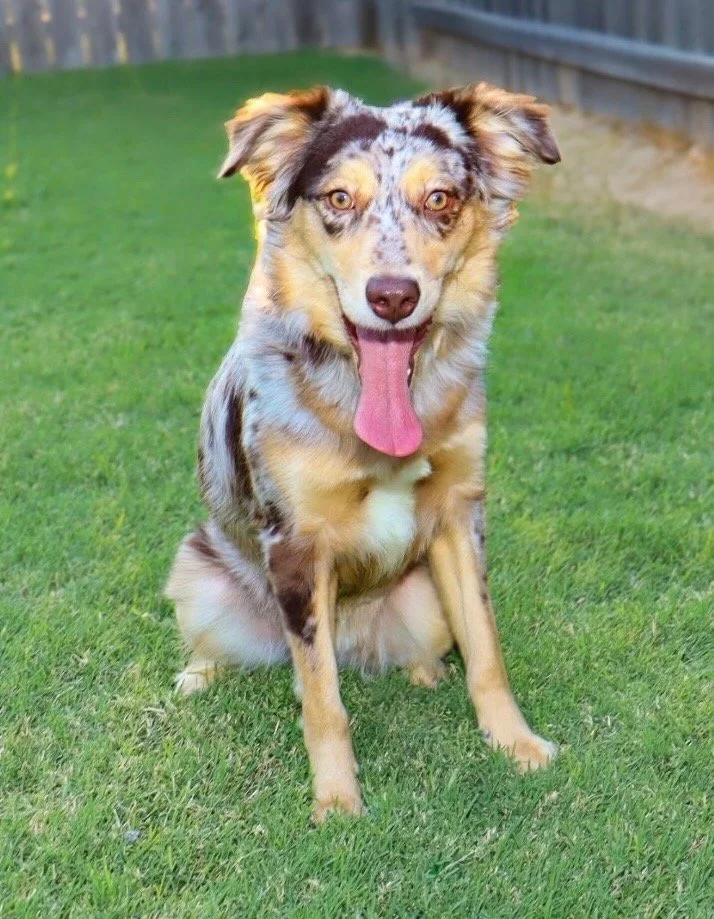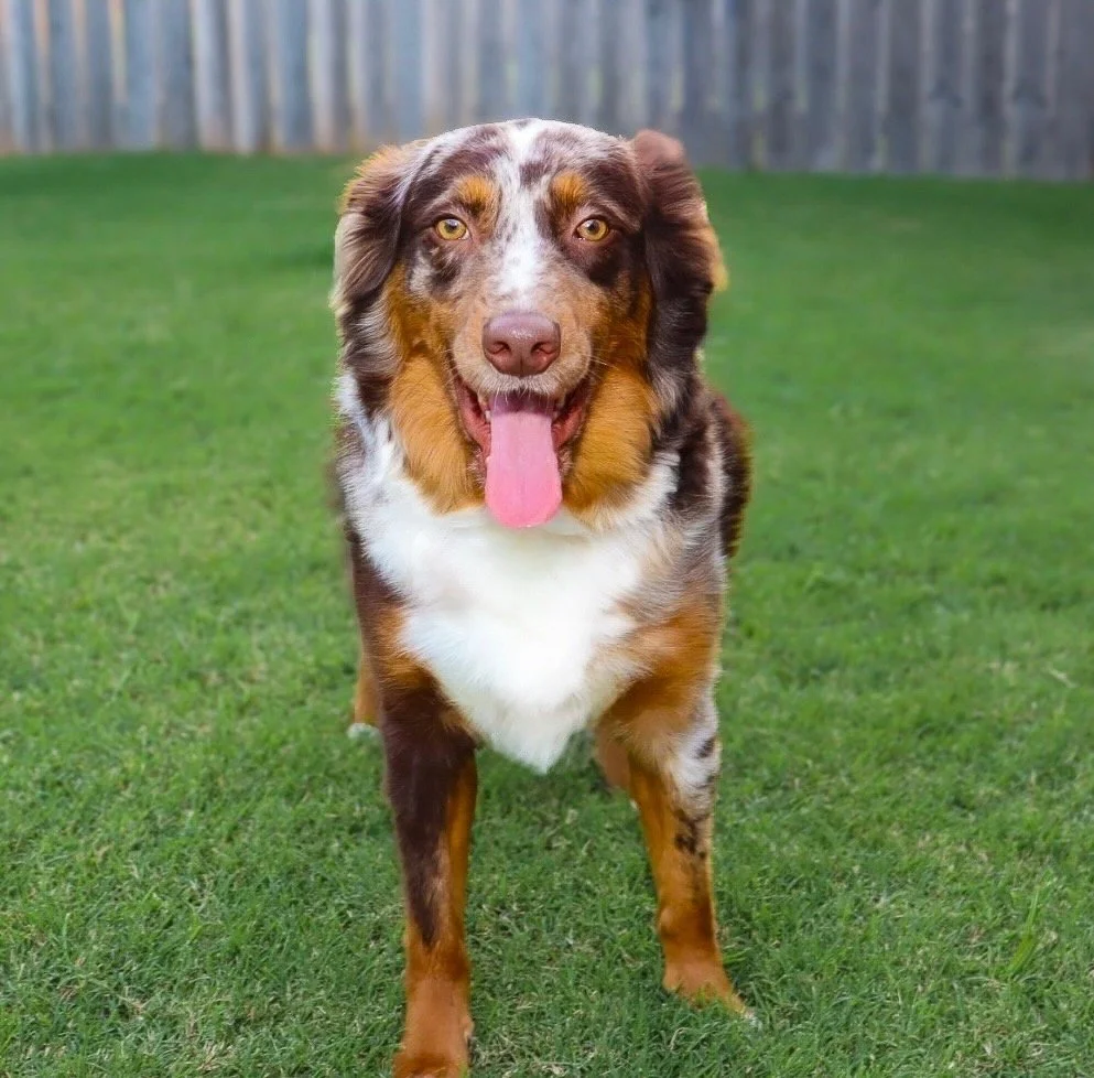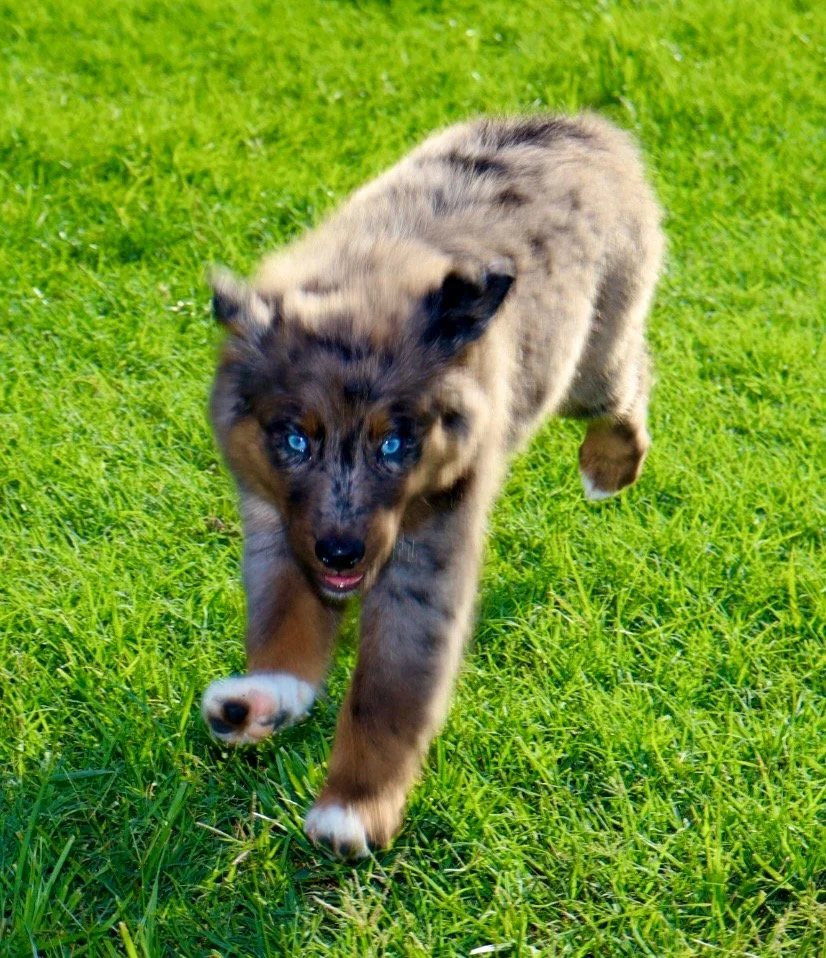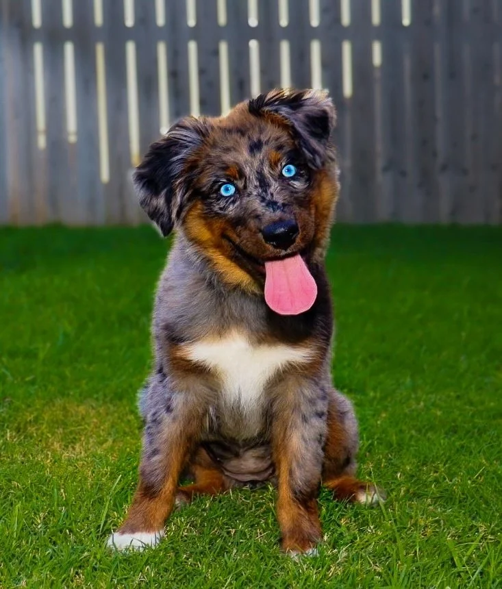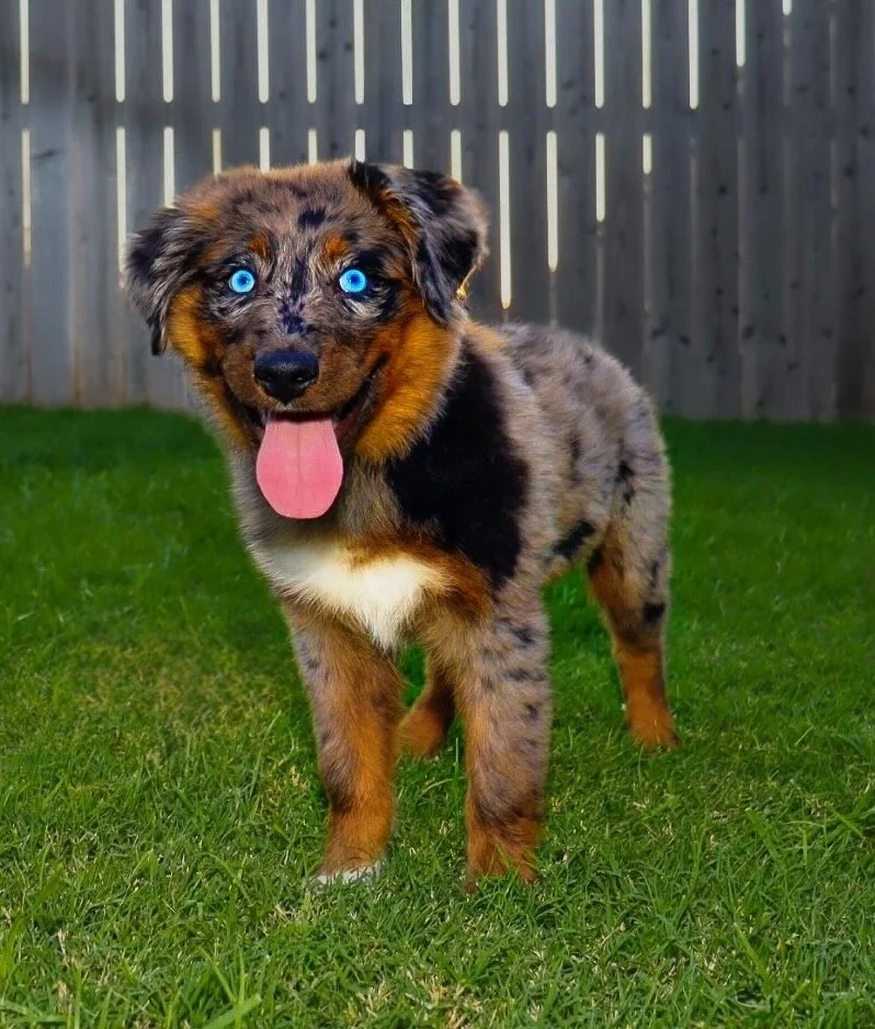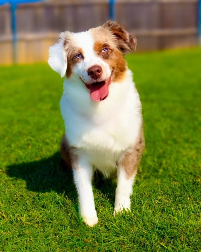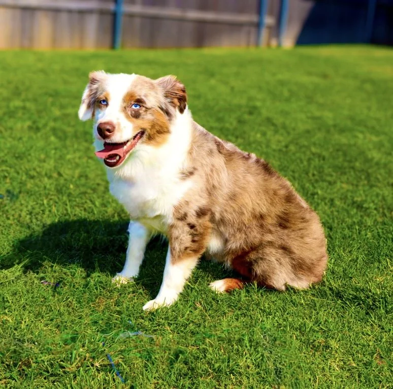 Meet Ellie – our fiery little athlete with a brain to match. This red merle beauty is a small standard Australian Shepherd with copper points and stunning amber eyes that seem to read your mind. Incredibly smart and eager to please, Ellie picks up new commands with ease and thrives when given a job to do. Whether she’s chasing a ball, zipping through agility equipment, or wrestling with her girl gang, she brings intensity and joy to everything she does.