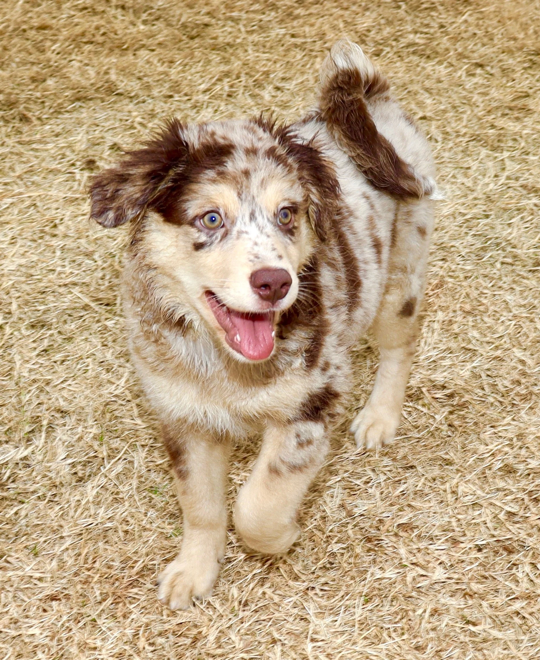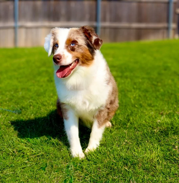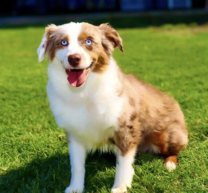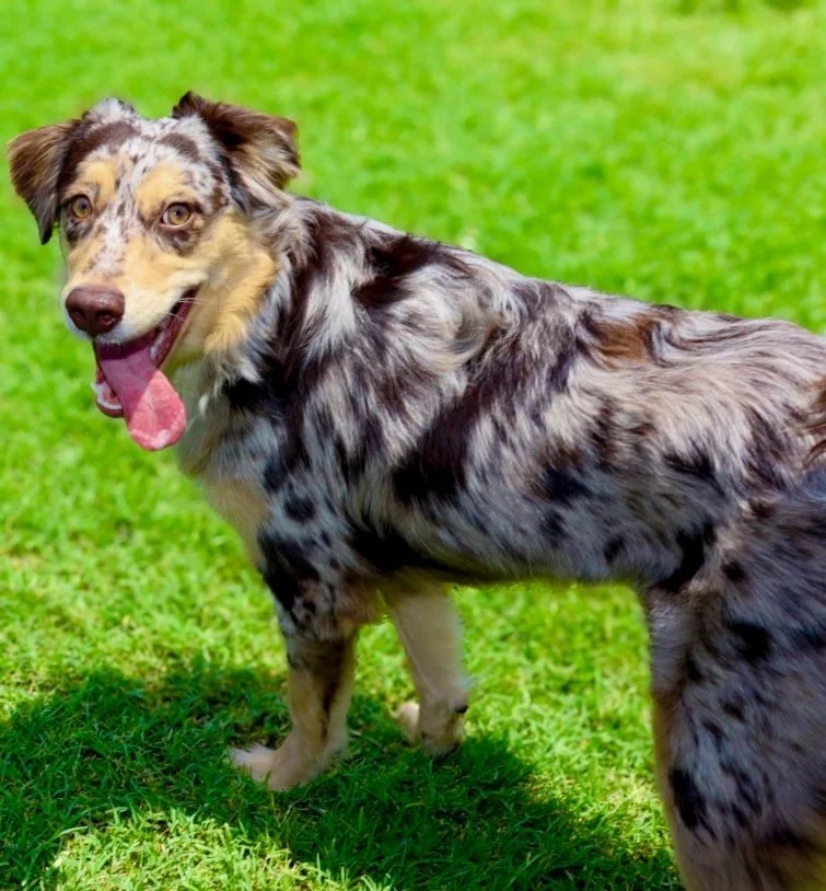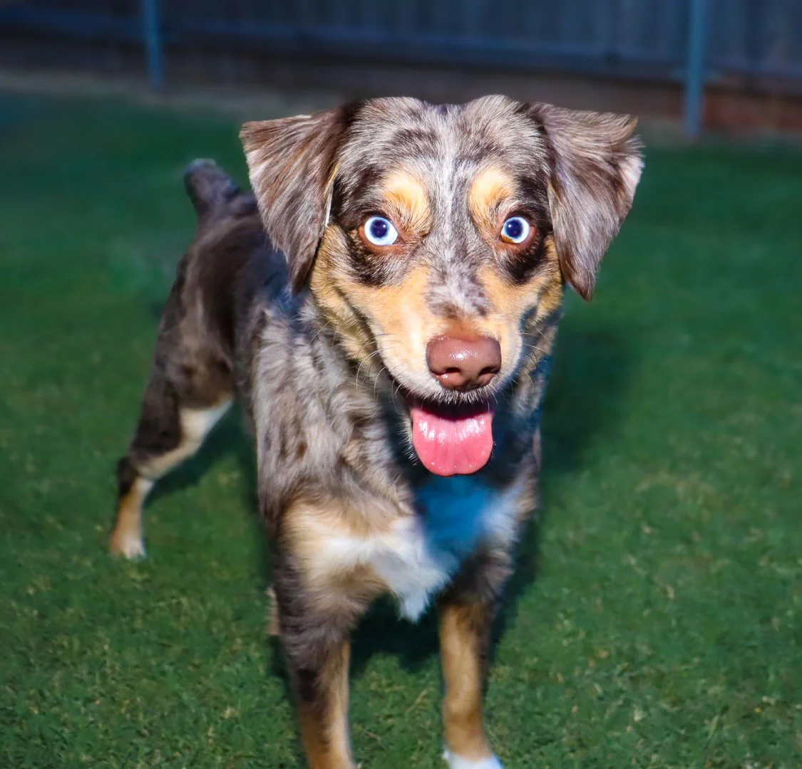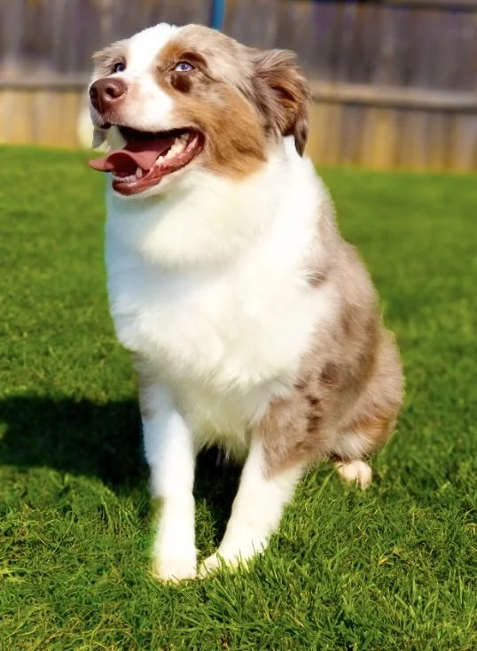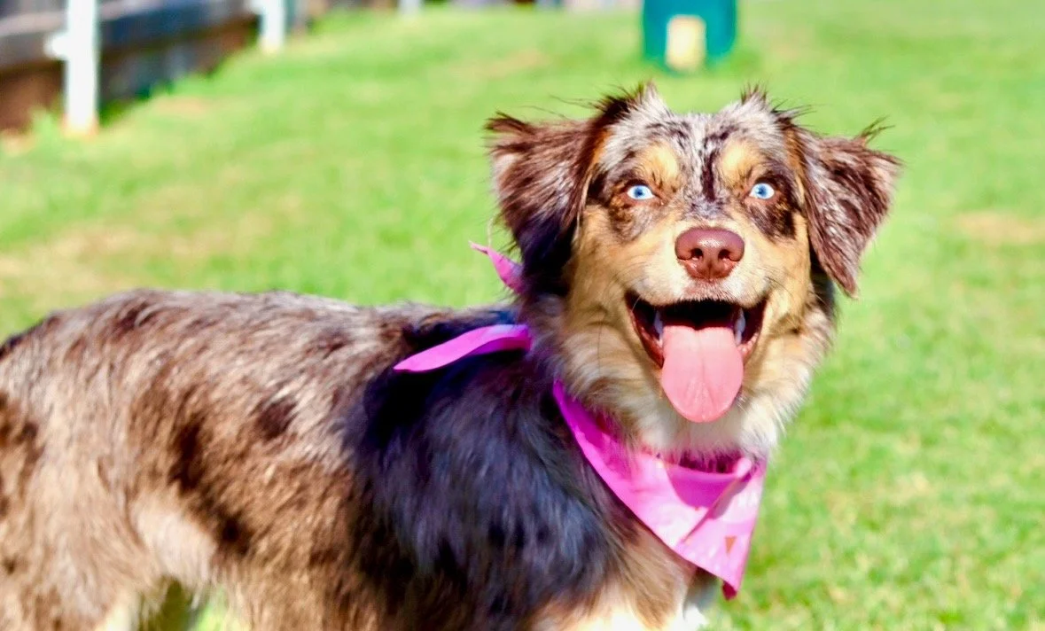Meet Ellie – our fiery little athlete with a brain to match. This red merle beauty is a small standard Australian Shepherd with copper points and stunning amber eyes that seem to read your mind. Incredibly smart and eager to please, Ellie picks up new commands with ease and thrives when given a job to do. Whether she’s chasing a ball, zipping through agility equipment, or wrestling with her girl gang, she brings intensity and joy to everything she does.