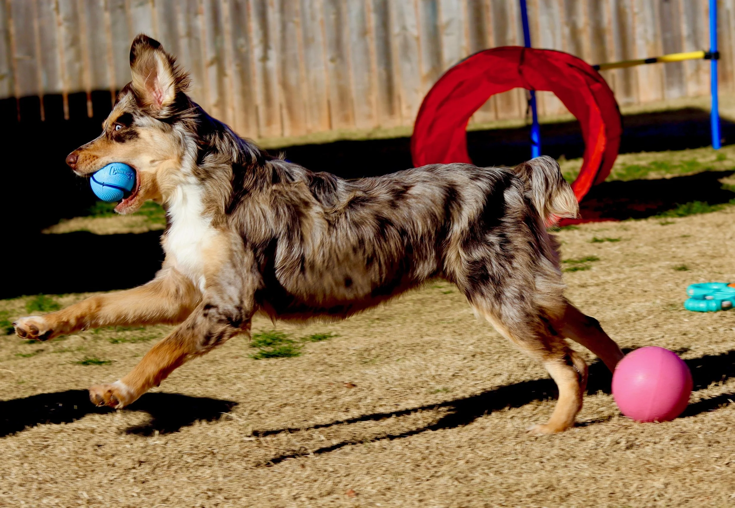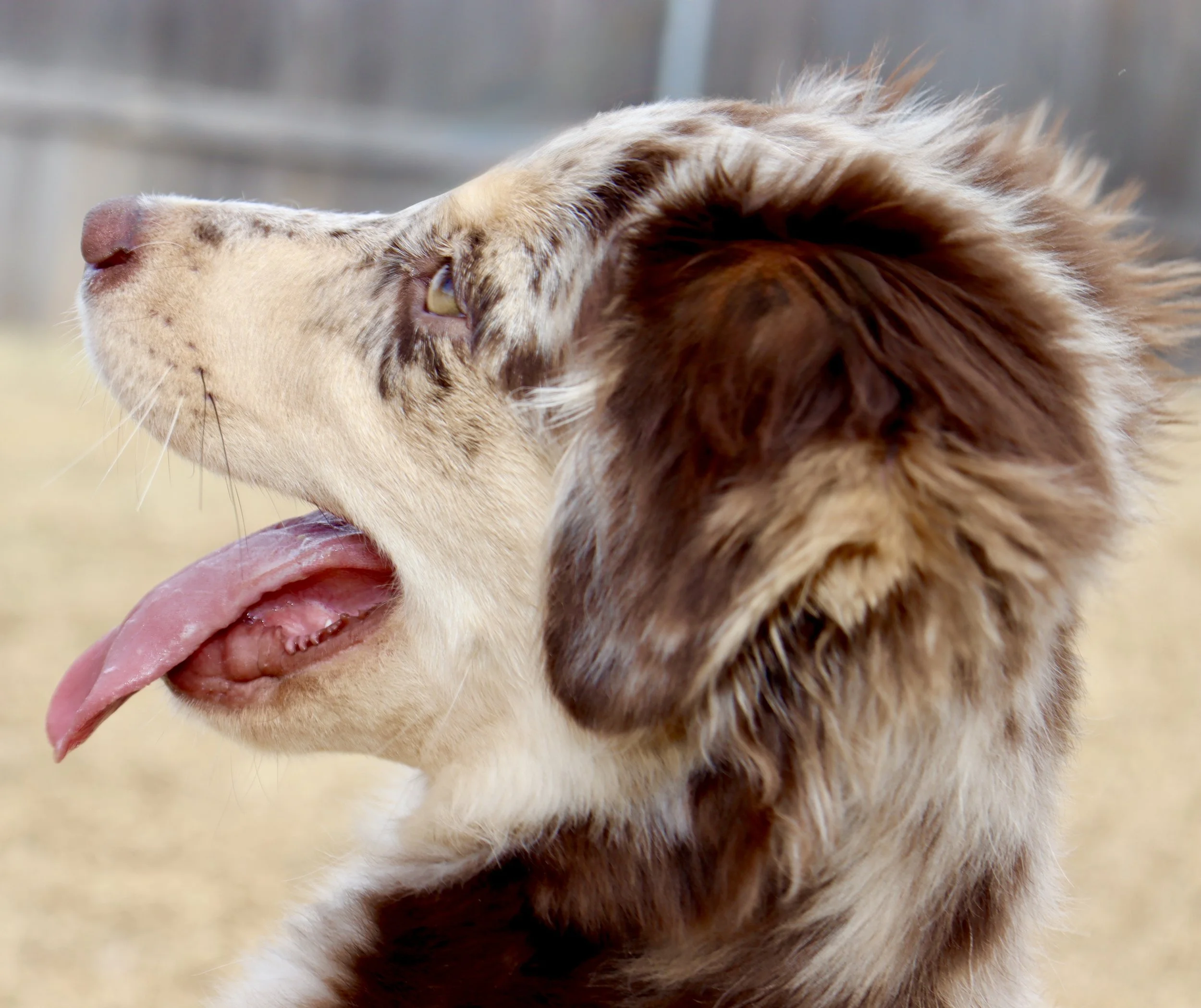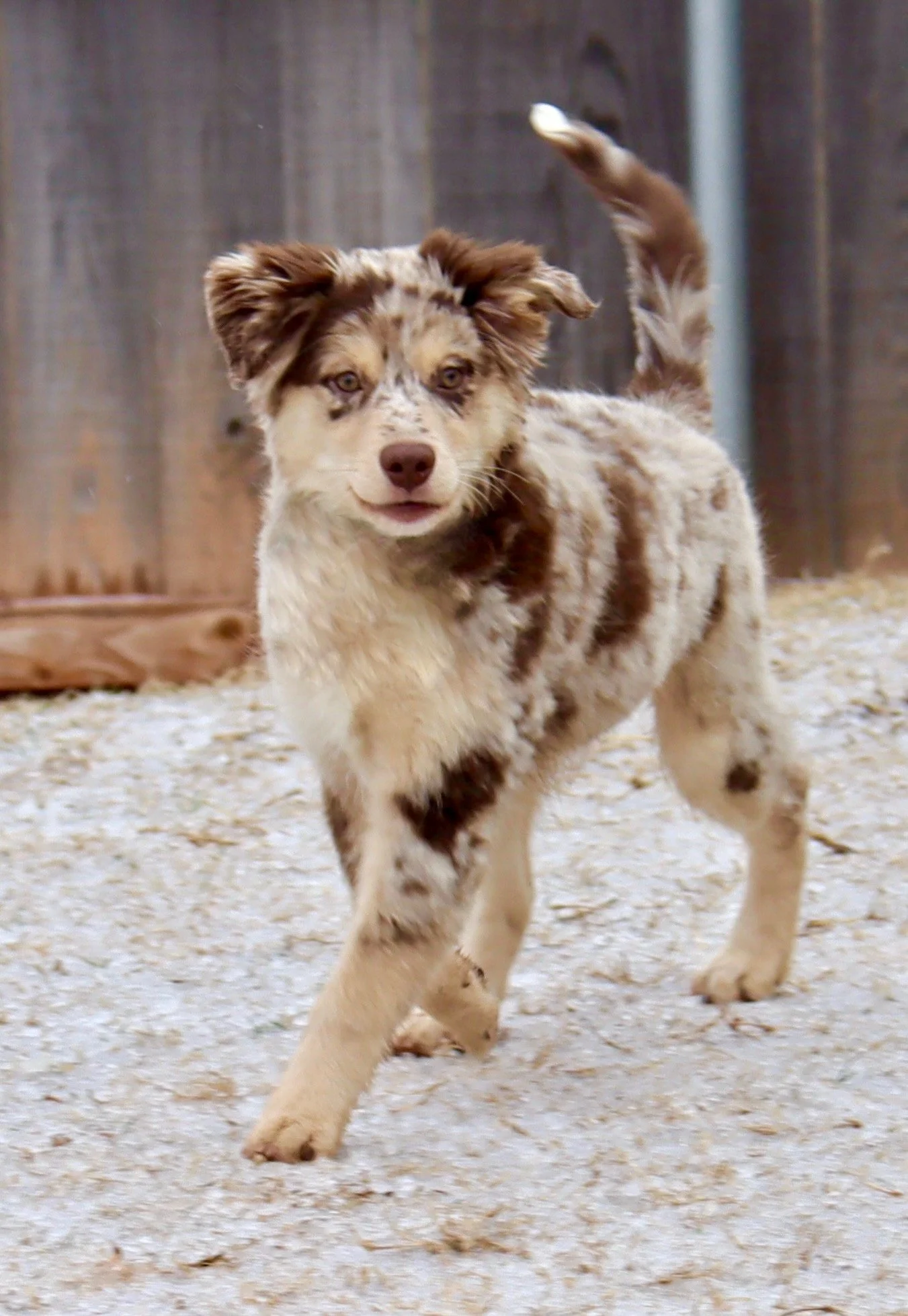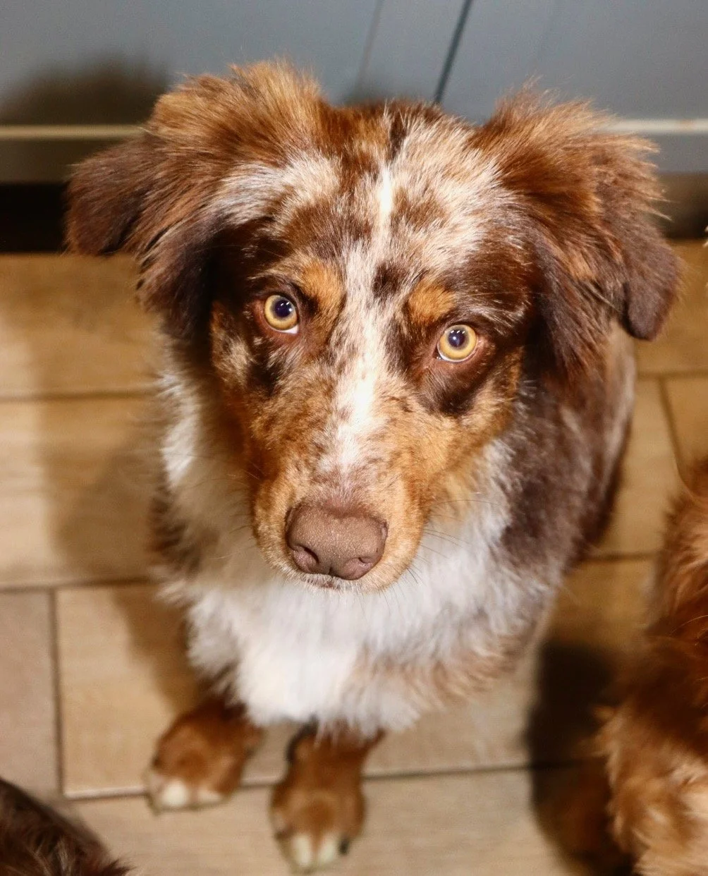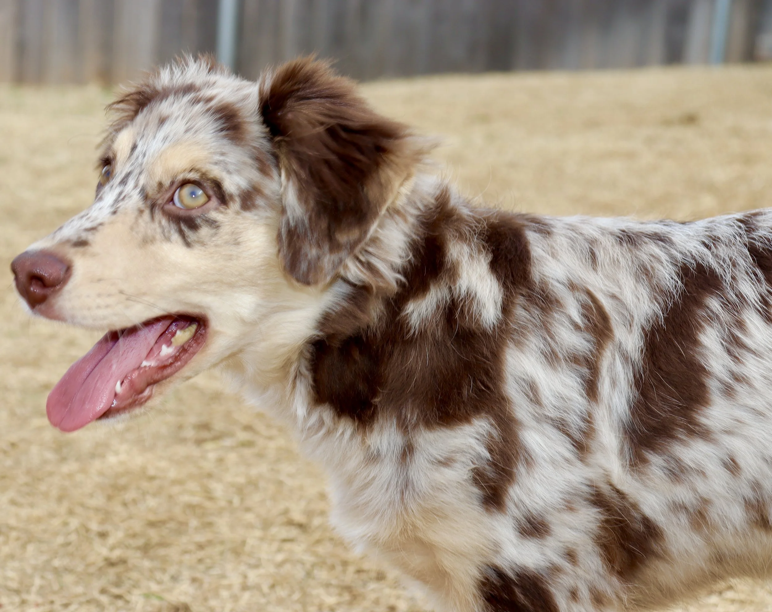 Meet Ellie – our fiery little athlete with a brain to match. This red merle beauty is a small standard Australian Shepherd with copper points and stunning amber eyes that seem to read your mind. Incredibly smart and eager to please, Ellie picks up new commands with ease and thrives when given a job to do. Whether she’s chasing a ball, zipping through agility equipment, or wrestling with her girl gang, she brings intensity and joy to everything she does.