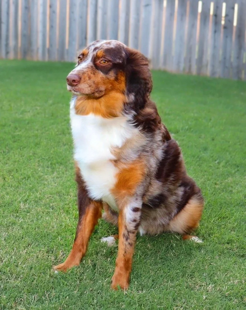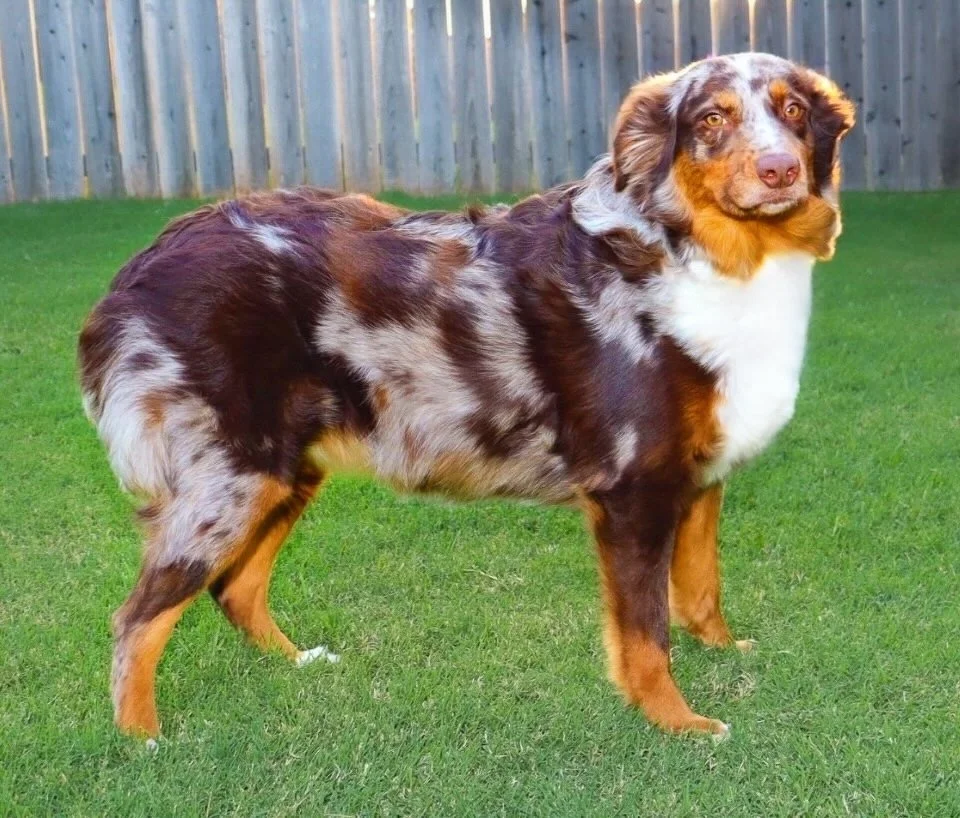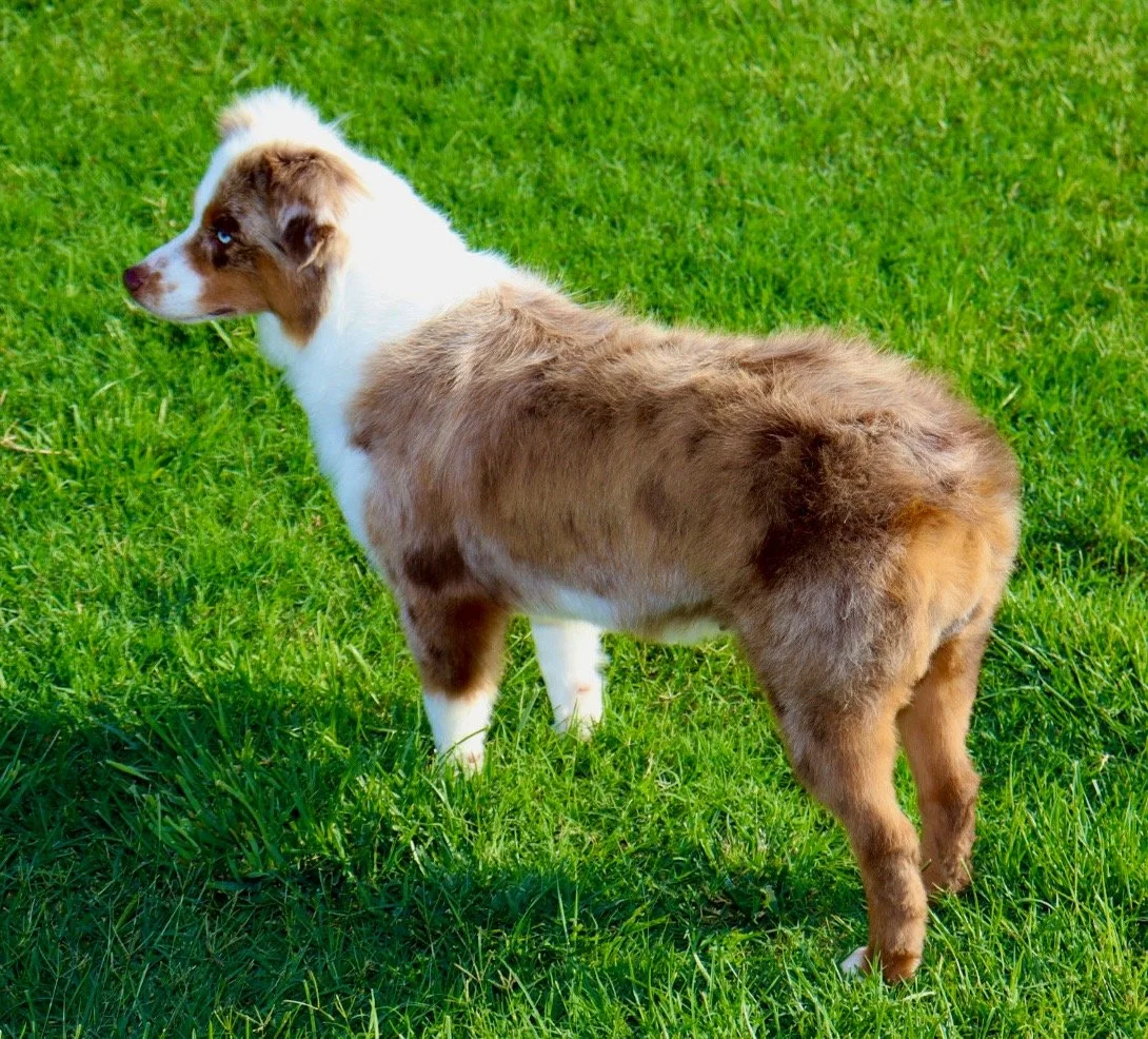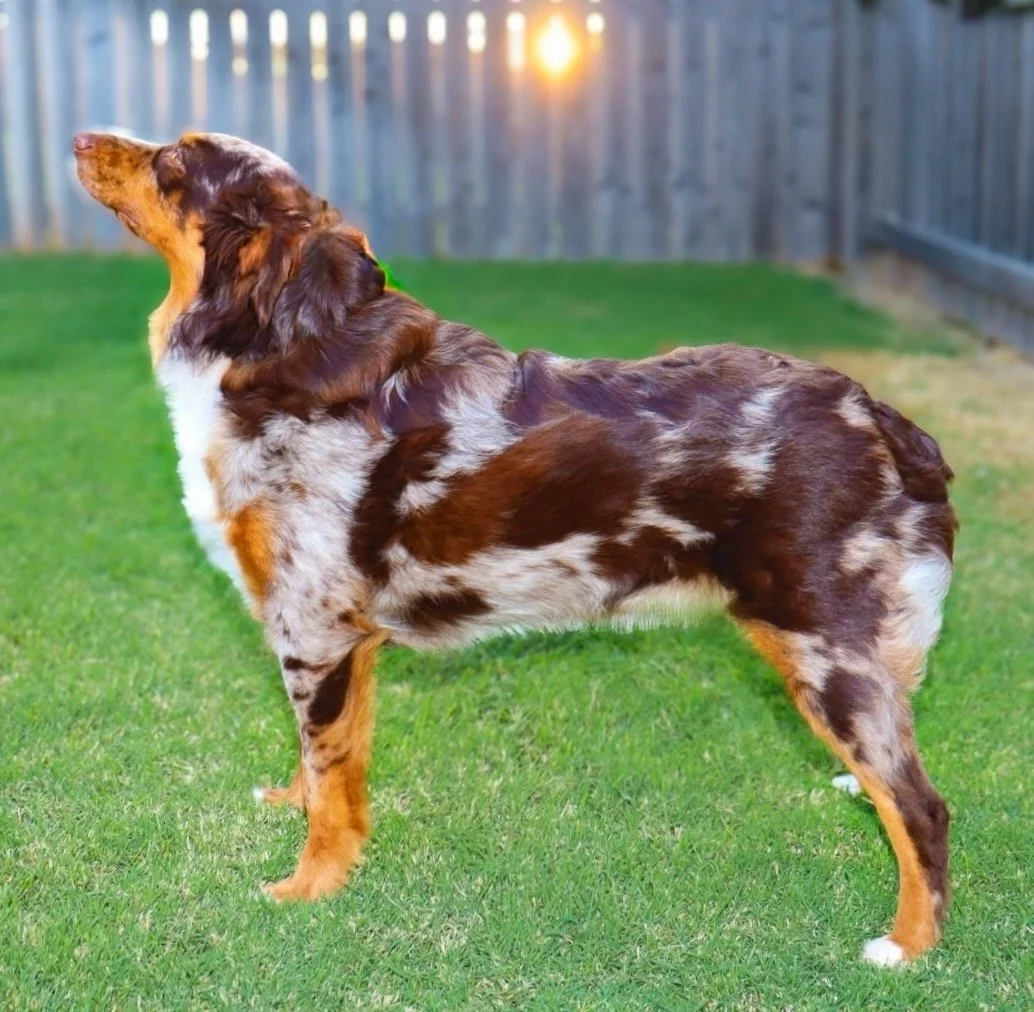 Holland came to us from R&T Aussies, out of fully health tested, clear parents, and my gosh are they beautiful. We’re excited to have her as part of our program, with plans to pair her with a perfect balanced stud in the future — combining their incredible temperament, structure, and pedigree into beautiful puppies with big potential.