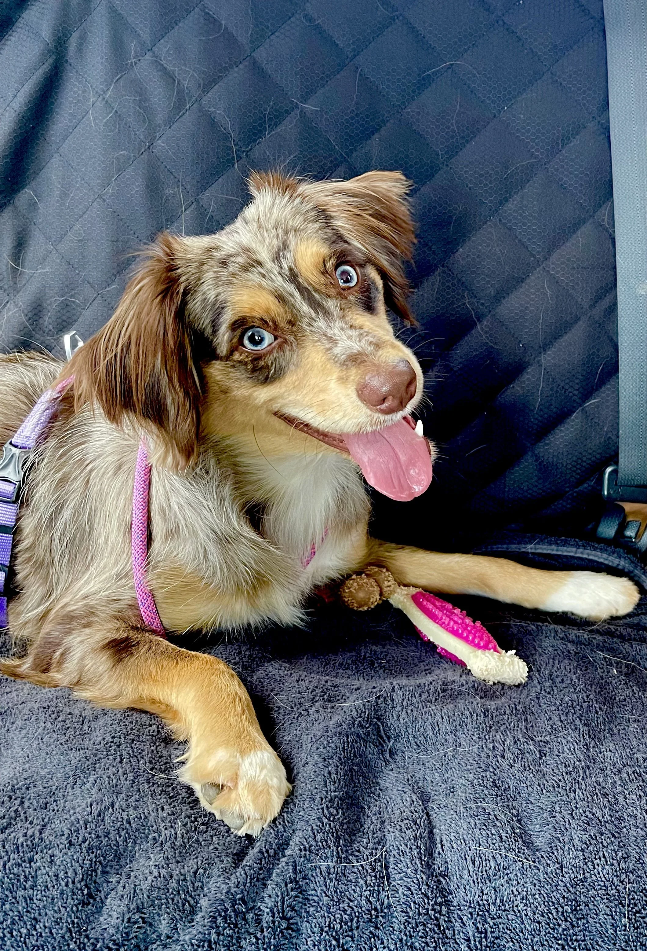 The best sweet, calm snuggles come from this Mini Aussie mama who’s got a heart full of love and loyalty. She’s the kind of dog who radiates warmth and gentleness, curling up next to us after a long day for those quiet, cozy moments. Her eyes, full of affection, show just how much she adores her humans. Despite her small size, her snuggles feel like the most comforting embrace, making us feel safe and cared for.